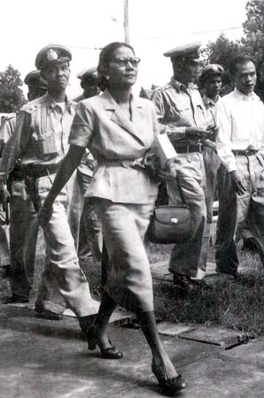 ตำรวจพาไปศาล ผู้ต้องหาหญิงคนเดียว ไม่รู้ใช้กำลังเท่าไหร่ ไปศาลแล้วพวกหนังสือพิมพ์ก็จะมาถ่ายรูป ตำรวจพยายามจะเอาฉันหลบกล้อง พอถึงศาลแล้วก็เห็นพวกผู้ต้องหาคนอื่น ๆ นั่งเป็นแถว แต่ของฉันไปนั่งเฉพาะ มีตำรวจคุม แหม ทุเรศจริง ๆ เชียว ทำกับฉันขนาดนี้