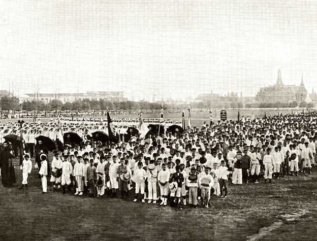 ภาพที่ 8 นักเรียนอัสสัมชัญที่ท้องสนามหลวง ในงานฉลองพระราชพิธีบรมราชาภิเษกพระบาทสมเด็จพระมงกุฎเกล้าเจ้าอยู่หัว ครั้งที่สอง ในปีค.ศ. 1911 สังเกตธงช้าง ธงชาติในสมัยนั้น และป้าย Christian High School