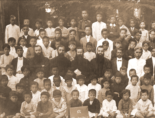 ภาพที่ 6 ภาพถ่ายภราดา ครู และนักเรียนชั้นมูล ราวค.ศ.1912 สังเกตเห็นมีทั้งเด็กไทยและเด็กต่างชาติมาเรียนรวมกัน