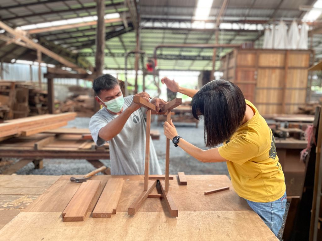 จากแบบที่วาดในกระดาษ คุณเอื้อยเริ่มพัฒนาเป็นเก้าอี้ไม้จริง ๆ แต่ต้องผ่านการทำโมเดล 1:5 ด้วยกระดาษและไม้สักถึงแปดครั้งกว่าจะสำเร็จออกมาเป็นเก้าอี้ต้นแบบ