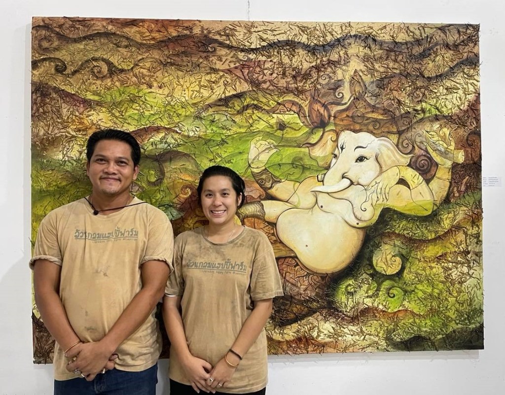 เราถนัดงานศิลปะ วาดภาพ การทำสี จึงเริ่มหาวัตถุดิบที่ไม่สิ้นเปลืองมากคือสีจากฟางข้าว อันดับแรกให้ชาวบ้านย้อมผ้าจากสีธรรมชาติ เมื่อย้อมผ้าเป็น พ่อๆแม่ ๆก็จะหวงแหนสีที่ย้อม ถ้าเอาสีย้อมผ้าทิ้งลงดิน ดินก็เสีย ก็เลยเอามาระบายสีและต่อยอดให้ชาวบ้านได้ทดลองงานศิลปะตามแบบของพวกเขา ….กลายเป็นงานศิลปะจากชาวนา ชาวไร่ ผมคิดว่า ใครทำงานศิลป์ก็ได้ แค่ระบายสี ทำแล้วรู้สึกมีความสุข ผ่อนคลายในใจก็ถือว่าสำเร็จแล้ว ไม่ว่างานนั้นจะออกมาแบบใด”