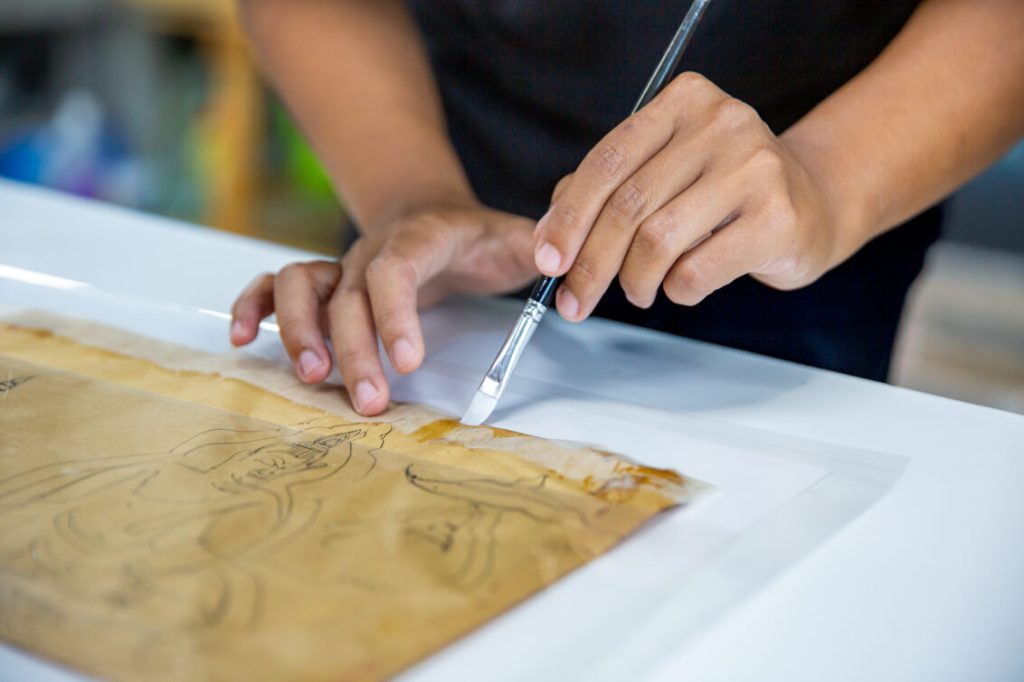 กลาสกรองรังสีUV 70% แทนที่กระจกเดิม วิธีการนี้ช่วยปกป้องผลงานจากรังสี UV อันเป็นสาเหตุสำคัญที่ทำให้ภาพซีดจางมากขึ้นในอนาคต ขั้นตอนสุดท้าย จะใช้แผ่นโฟมบอร์ดชนิดไร้กรดปิดหลังกรอบภาพให้เรียบร้อย เนื่องจากโฟมบอร์ดมีคุณสมบัติในการช่วยระบายอากาศได้ดี น้ำหนักเบา จึงสามารถใช้แทนแผ่นไม้อัดในการปิดกรอบรูปได้”